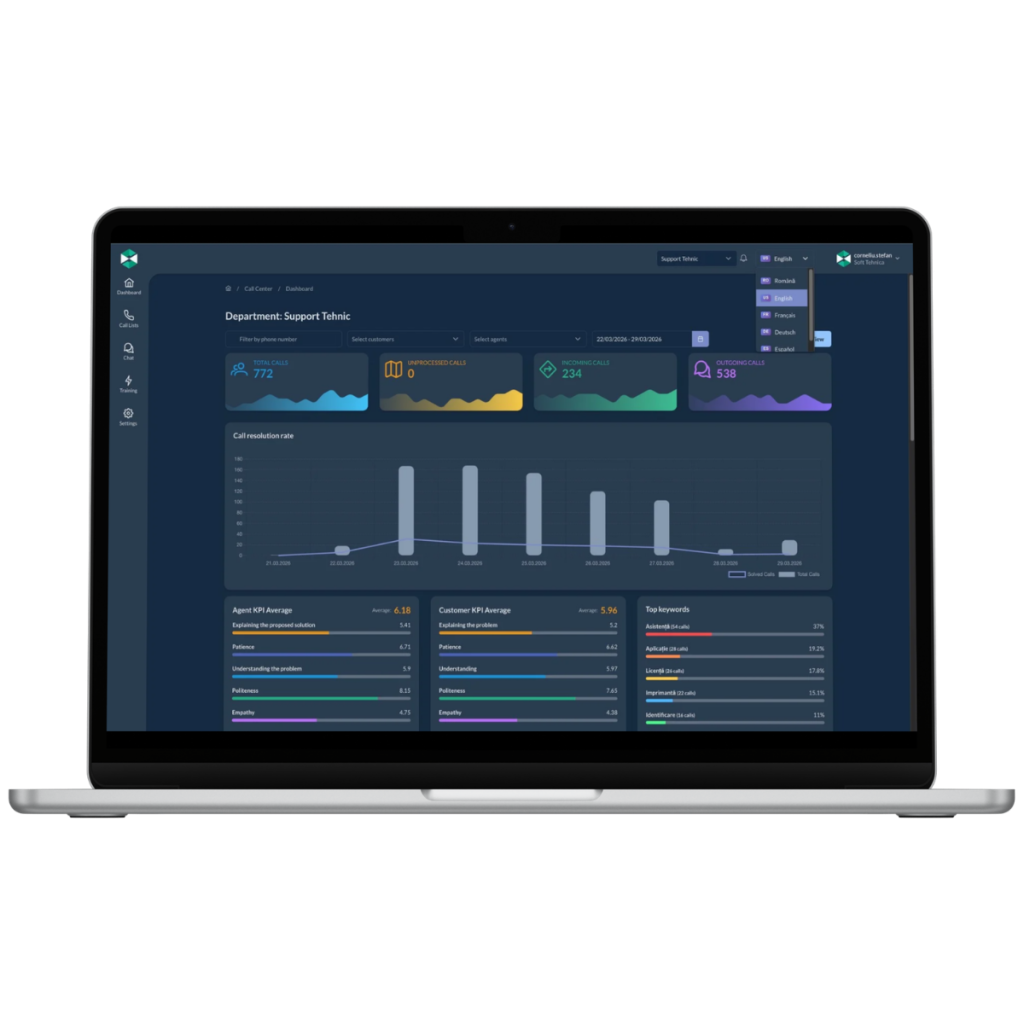 Știi exact ce se întâmplă în fiecare convorbire a echipei tale. Scoruri, transcrieri, analiză sentiment — totul accesibil dintr-un singur dashboard