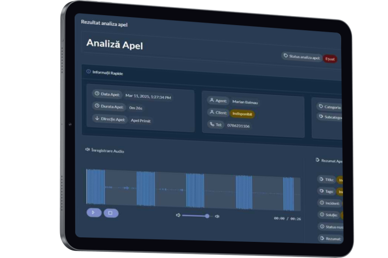 Aidoo Analyzer transcrie și analizează automat 100% din convorbirile din call center-ul tău. Scoruri, sentiment, cuvinte cheie — totul într-un singur dashboard, în timp real.